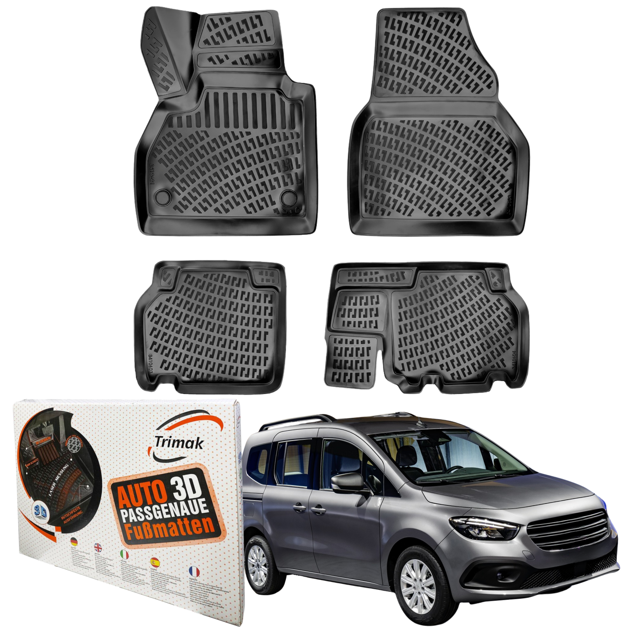 Maximaler Schutz trifft auf perfekte Passform: Die passgenauen Trimak Gummimatten wurden mithilfe modernster 3D-Laserscantechnologie speziell für den Trimak Mercedes CITAN (W415) 2012 - 2021 Auto AllWetterGummimatten entwickelt.
