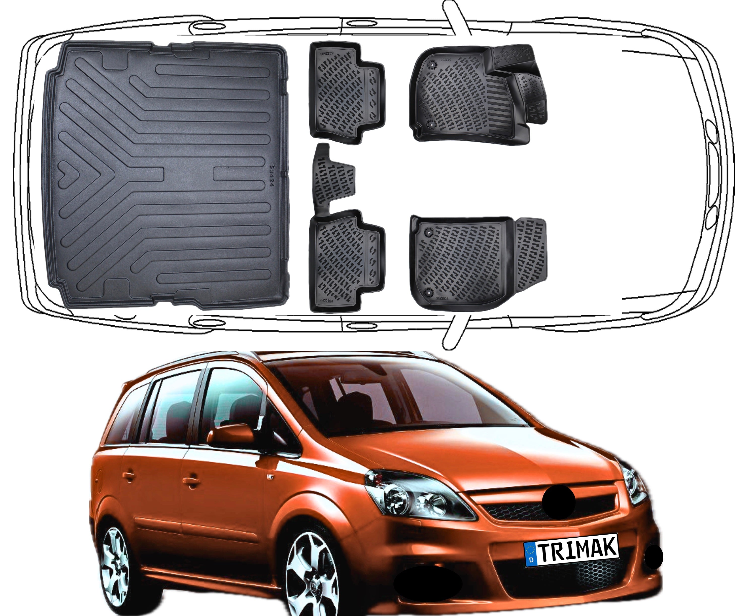 3D Fußmatten & Kofferraumwanne Auto Set Kompatibel mit Opel Zafira B 2005–2014 ** Sitzordnung für 5 Personen **