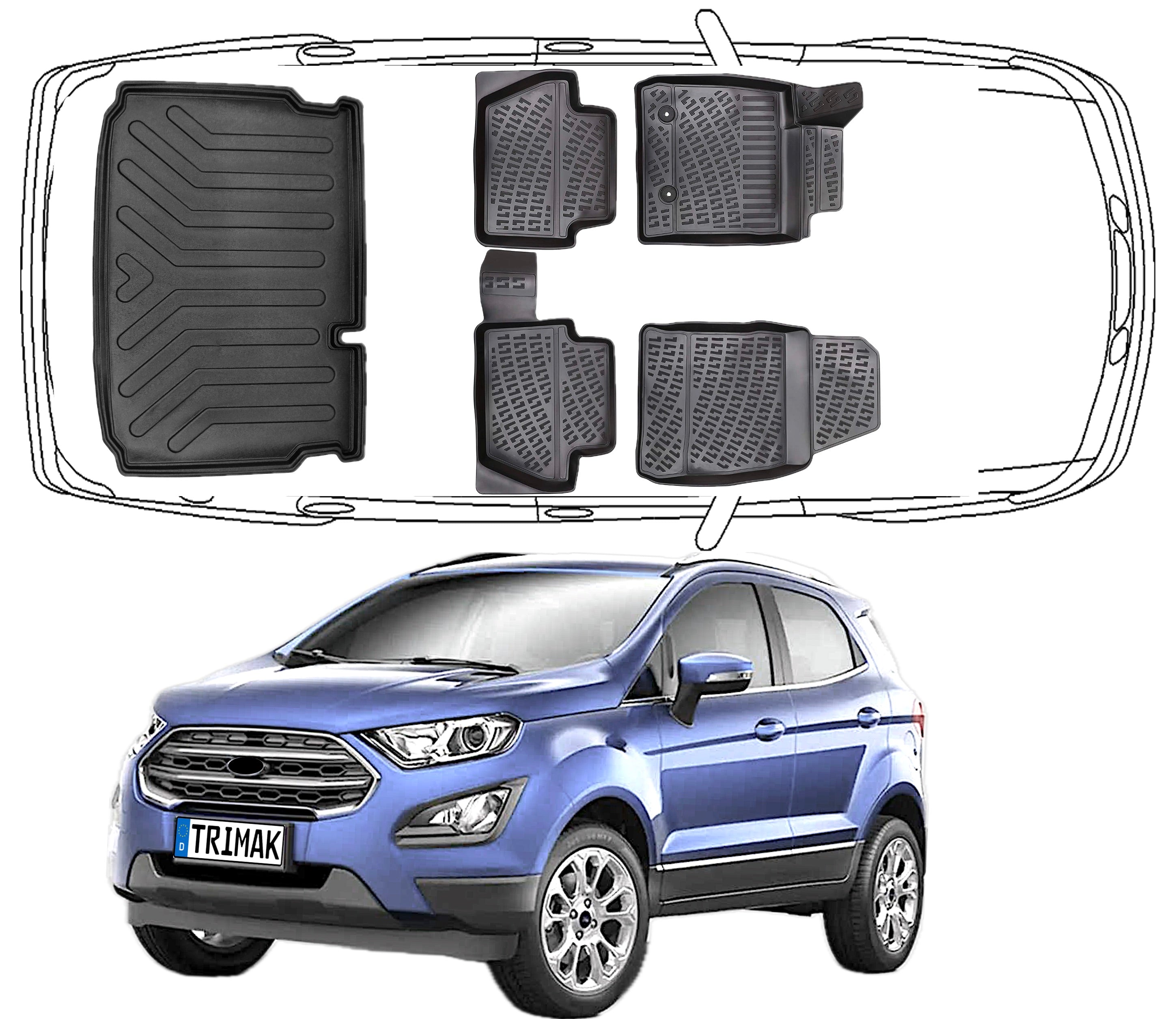 3D Fußmatten & Untere Kofferraumwanne Auto Set Kompatibel mit Ford Ecosport 2012 - 2023