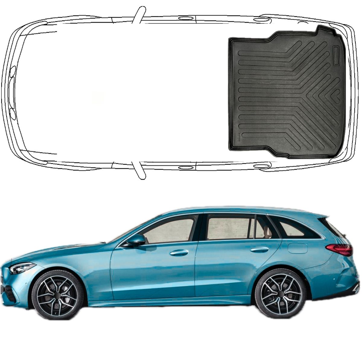 Maximaler Schutz trifft auf perfekte Passform: Die passgenauen Trimak Gummimatten wurden mithilfe modernster 3D-Laserscantechnologie speziell für Mercedes C-Klasse S206 T Modell ab 2021 den Trimak Kofferraumwanne entwickelt.