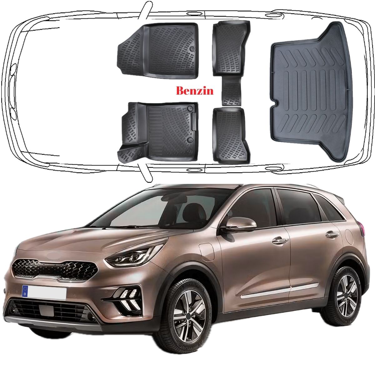 3D Auto Fußmatten & Kofferraumwanne Set Kompatibel mit KIA Niro 1.Gen Benzin 2016-2022