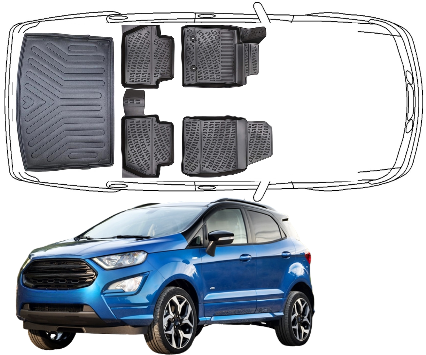 3D Fußmatten & Obere Kofferraumwanne Auto Set Kompatibel mit Ford Ecosport 2012 - 2023