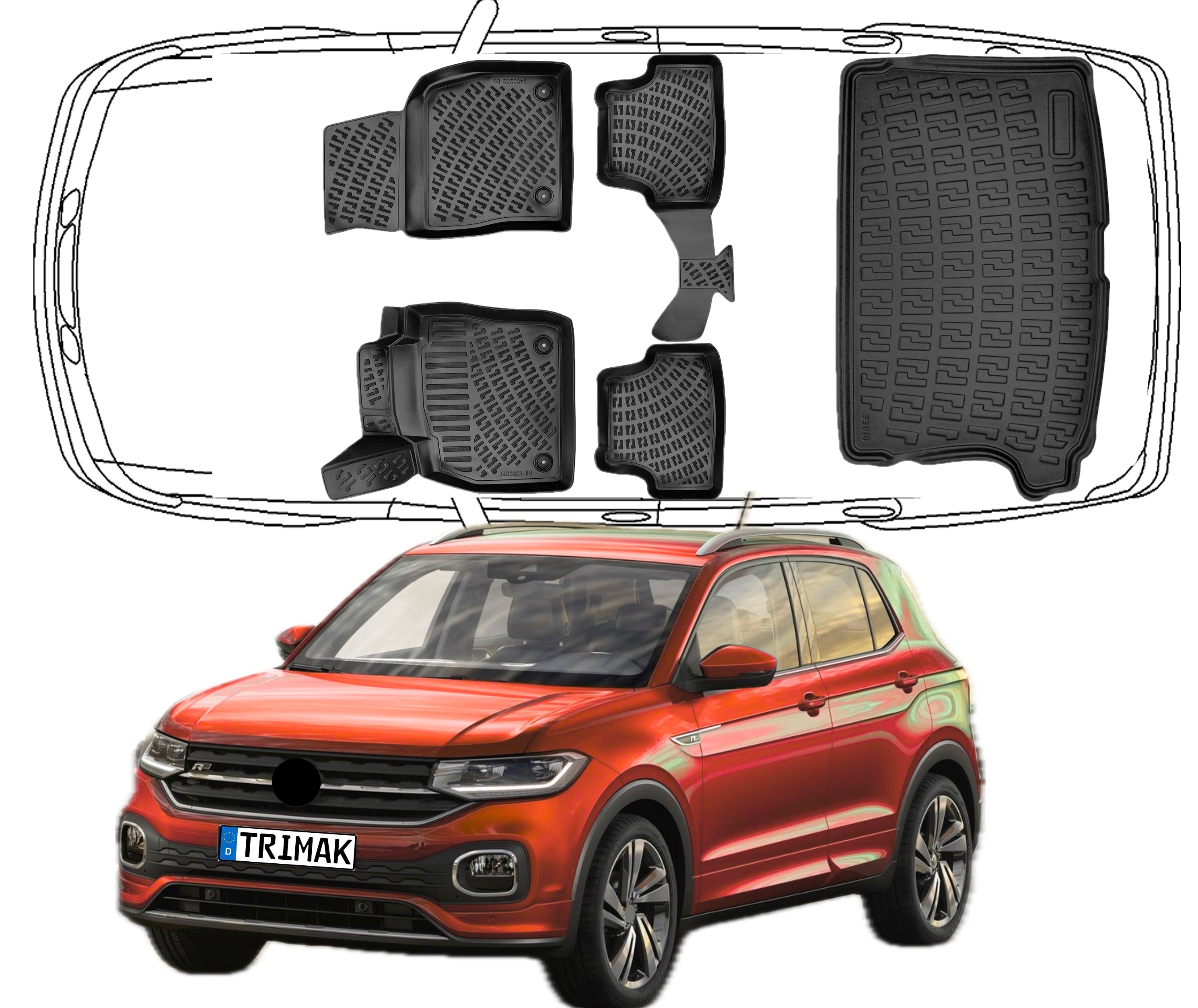 3D Fußmatten & Obere Kofferraumwanne Auto Set Kompatibel mit VW T-Cross Obere Kofferraummatte