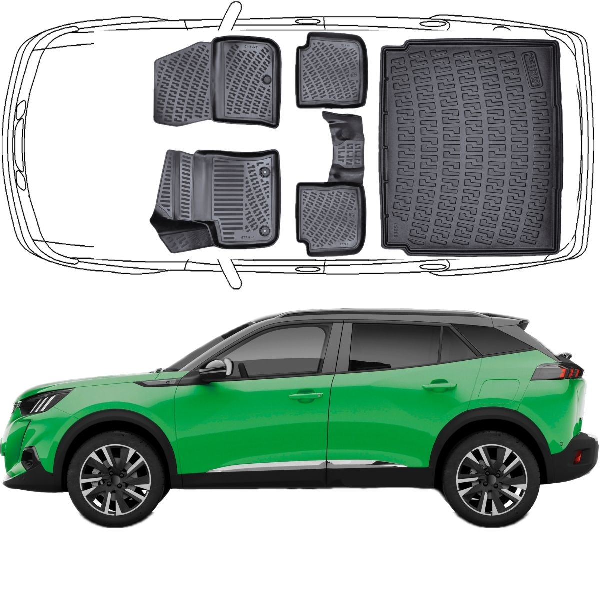 3D Fußmatten & Untere Kofferraumwanne Auto Set Kompatibel mit Peugeot e-2008 ab 2020 Kofferraumwanne