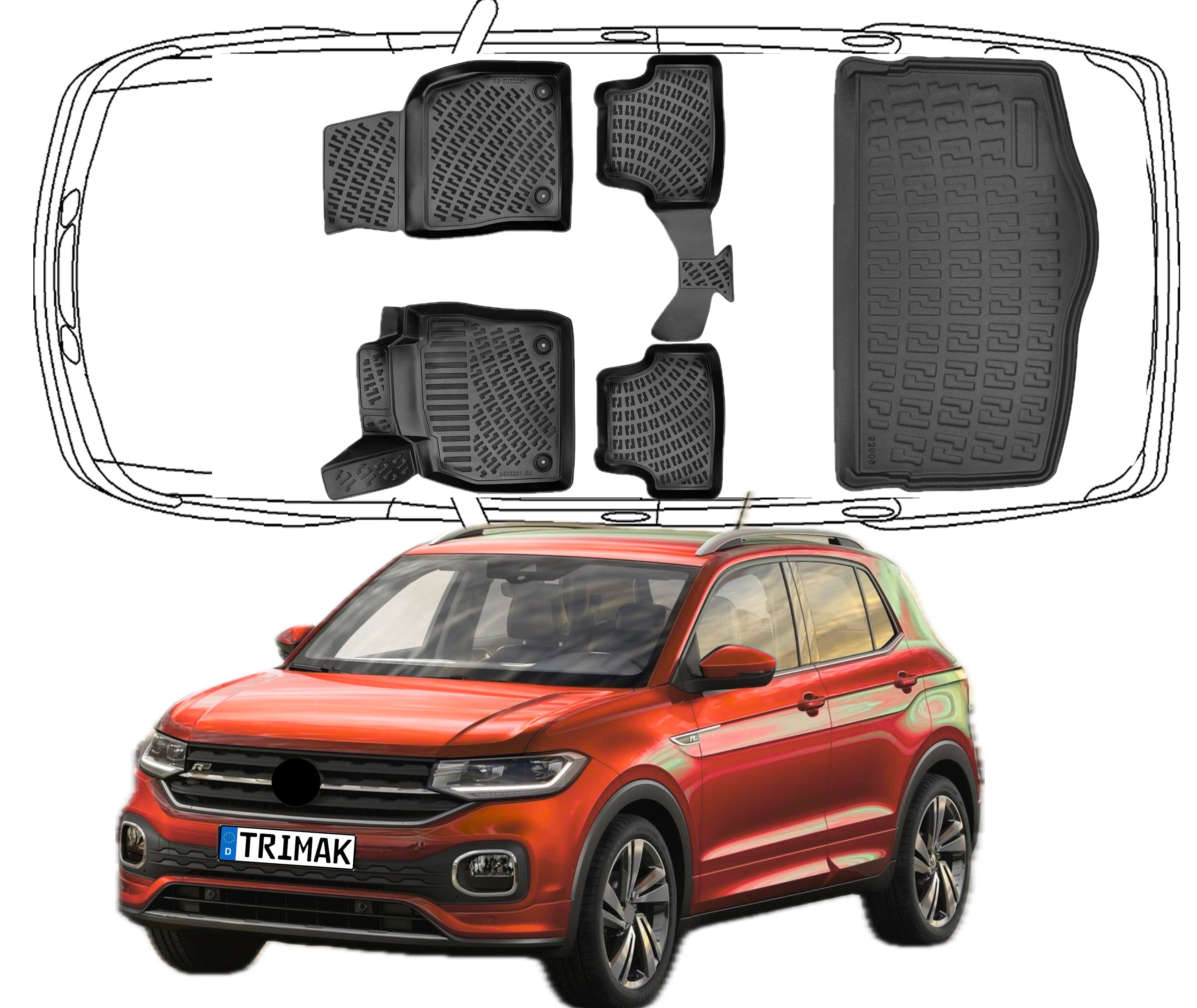 Maximaler Schutz trifft auf perfekte Passform: Die passgenauen Trimak Gummimatten wurden mithilfe modernster 3D-Laserscantechnologie speziell für den 3D Fußmatten & Untere Kofferraumwanne Auto Set Kompatibel mit VW T-Cross 2018 - 2024 entwickelt.