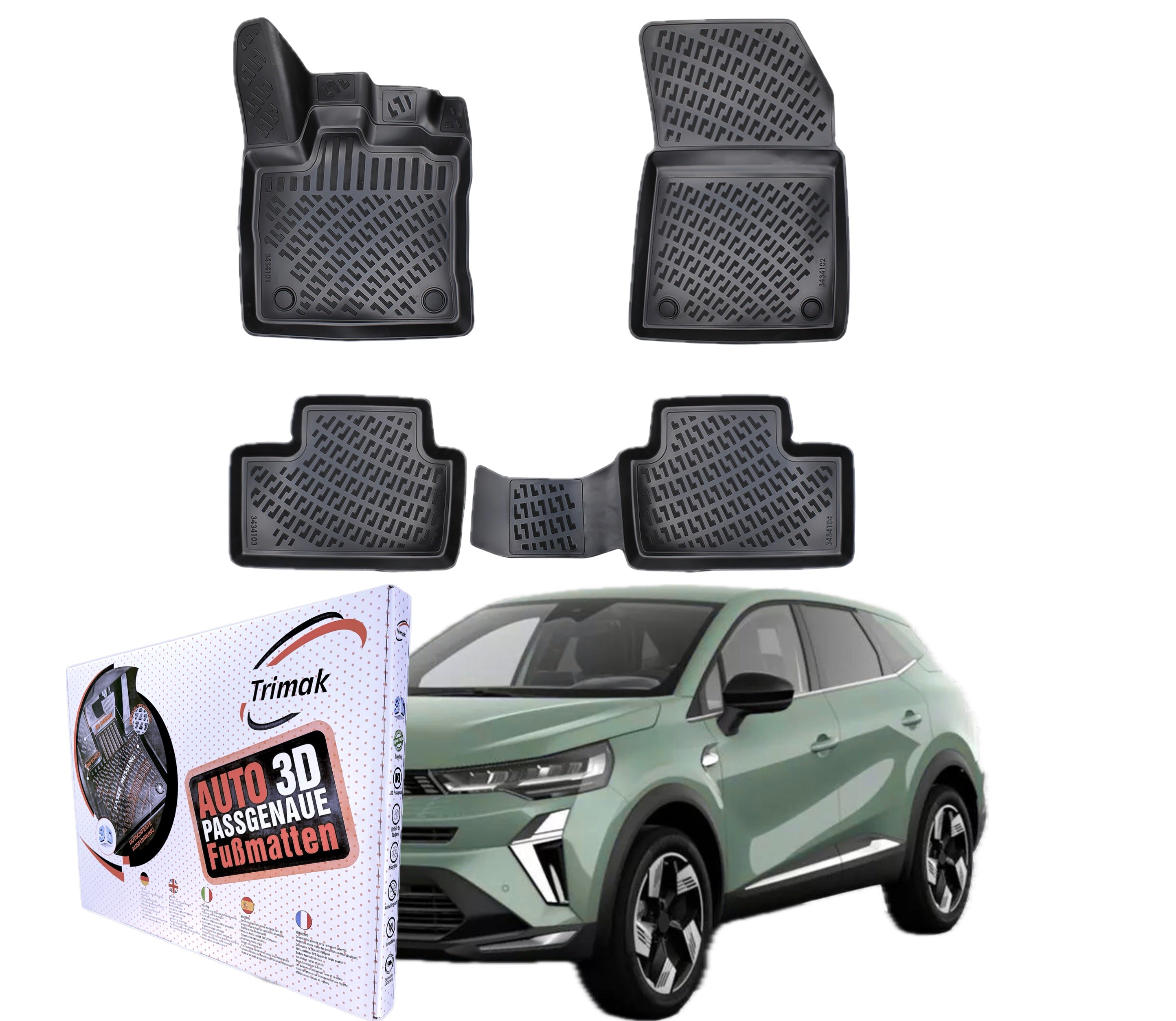 Maximaler Schutz trifft auf perfekte Passform: Die passgenauen Trimak Gummimatten wurden mithilfe modernster 3D-Laserscantechnologie speziell für den Trimak Renault Symbioz 2024 -- Auto AllWetterGummimatten entwickelt.