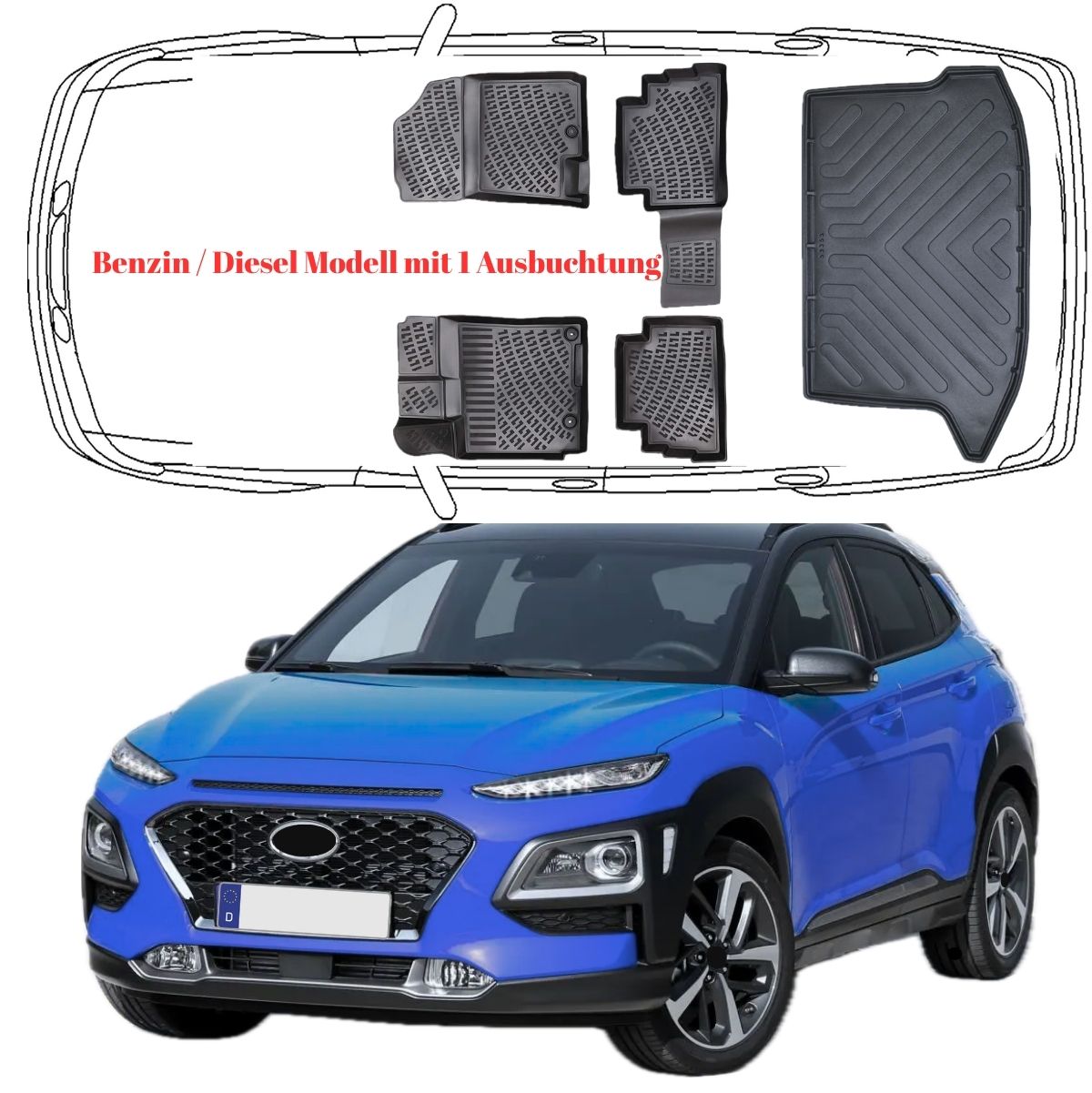 Maximaler Schutz trifft auf perfekte Passform: Die passgenauen Trimak Gummimatten wurden mithilfe modernster 3D-Laserscantechnologie speziell für den 3D Auto Fußmatten & Kofferraumwanne Set Kompatibel mit Hyundai Kona 1.Gen 2017-2023 Model mit 1 Ausbuchtung entwickelt.