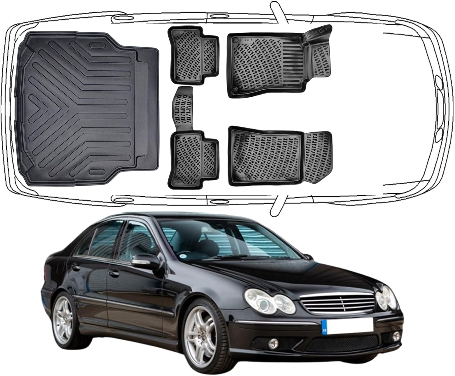 3D Fußmatten & Kofferraumwanne Auto Set Kompatibel mit Mercedes_Benz C Klasse W203 Sedan Limousine 2000 - 2007