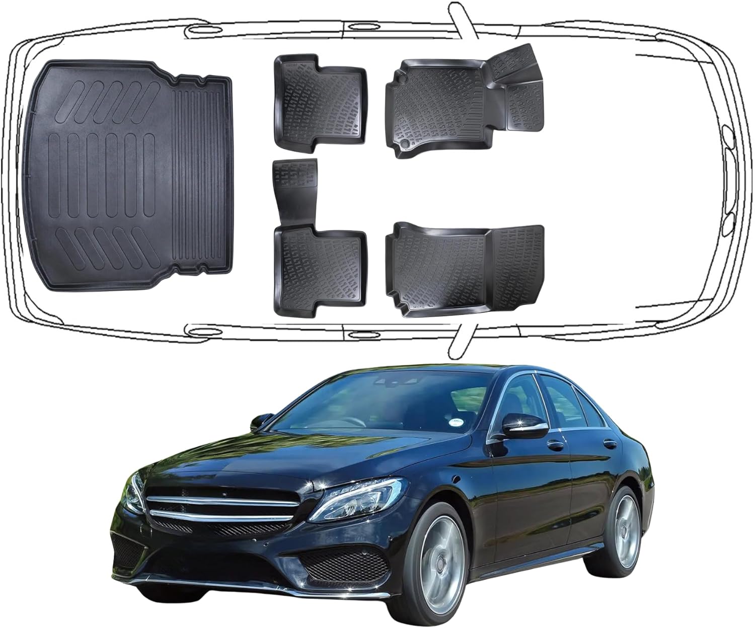 3D Fußmatten & Kofferraumwanne Auto Set Kompatibel mit MERCEDES C Klasse W204 Limousune 2007 - 2014 Umklappbare Rücksitze