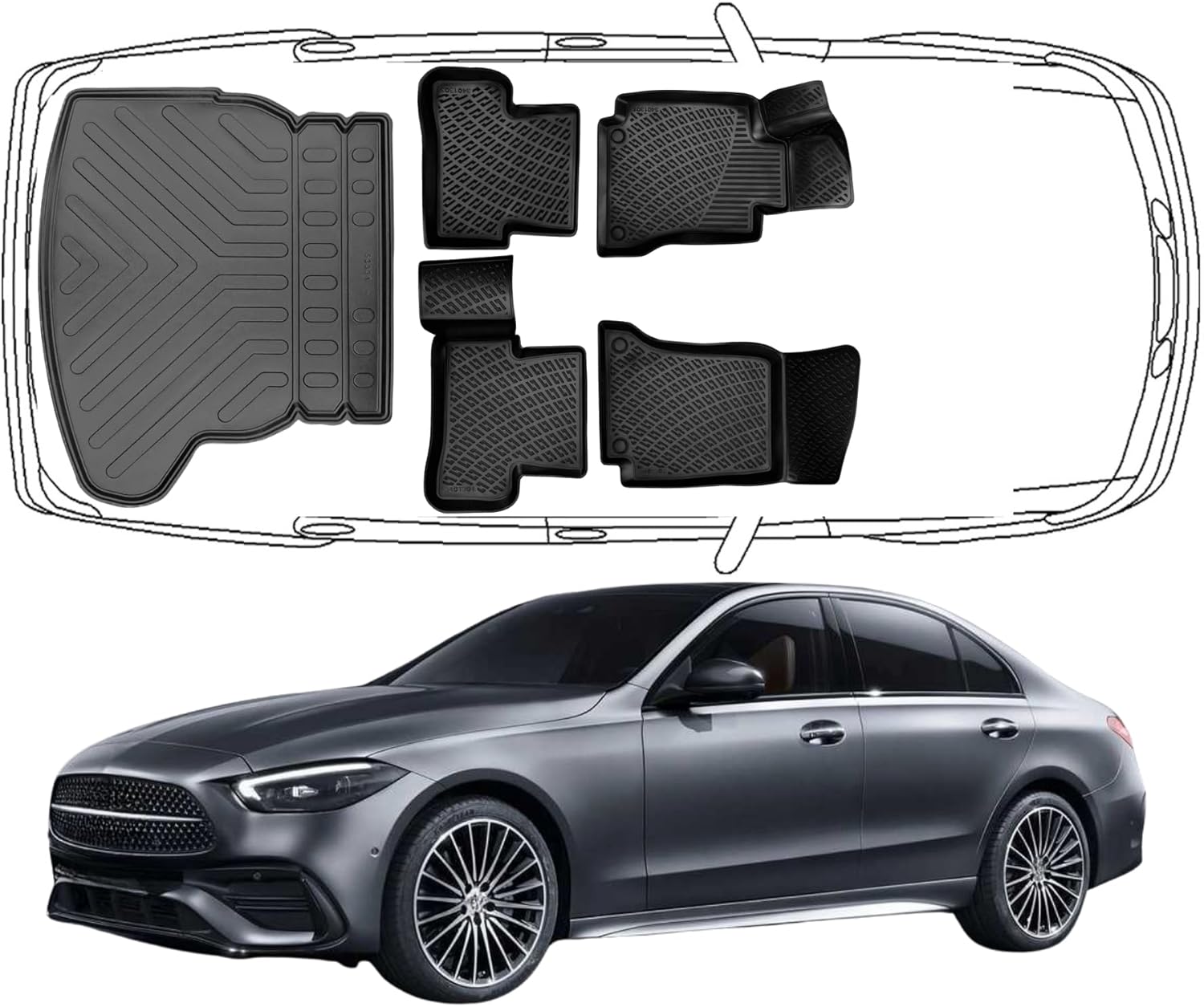 3D Fußmatten & Kofferraumwanne Auto Set Kompatibel mit Mercedes C Klasse W205 Limousune 2014 - 2022 Umklappbare Rücksitze mit rechtem Ausbuchtung