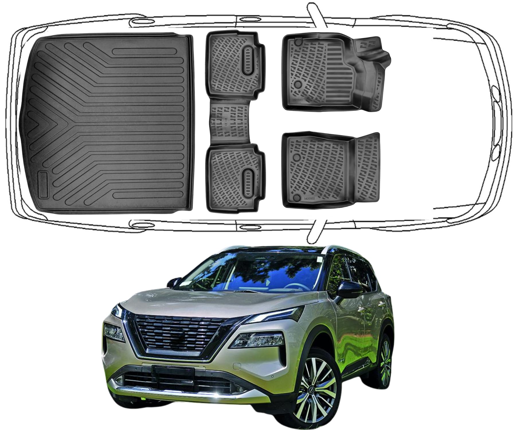 3D Fußmatten & Kofferraumwanne Auto Set Kompatibel mit Nissan X-Trail 4.Gen Mild-Hybrid 2021-2026