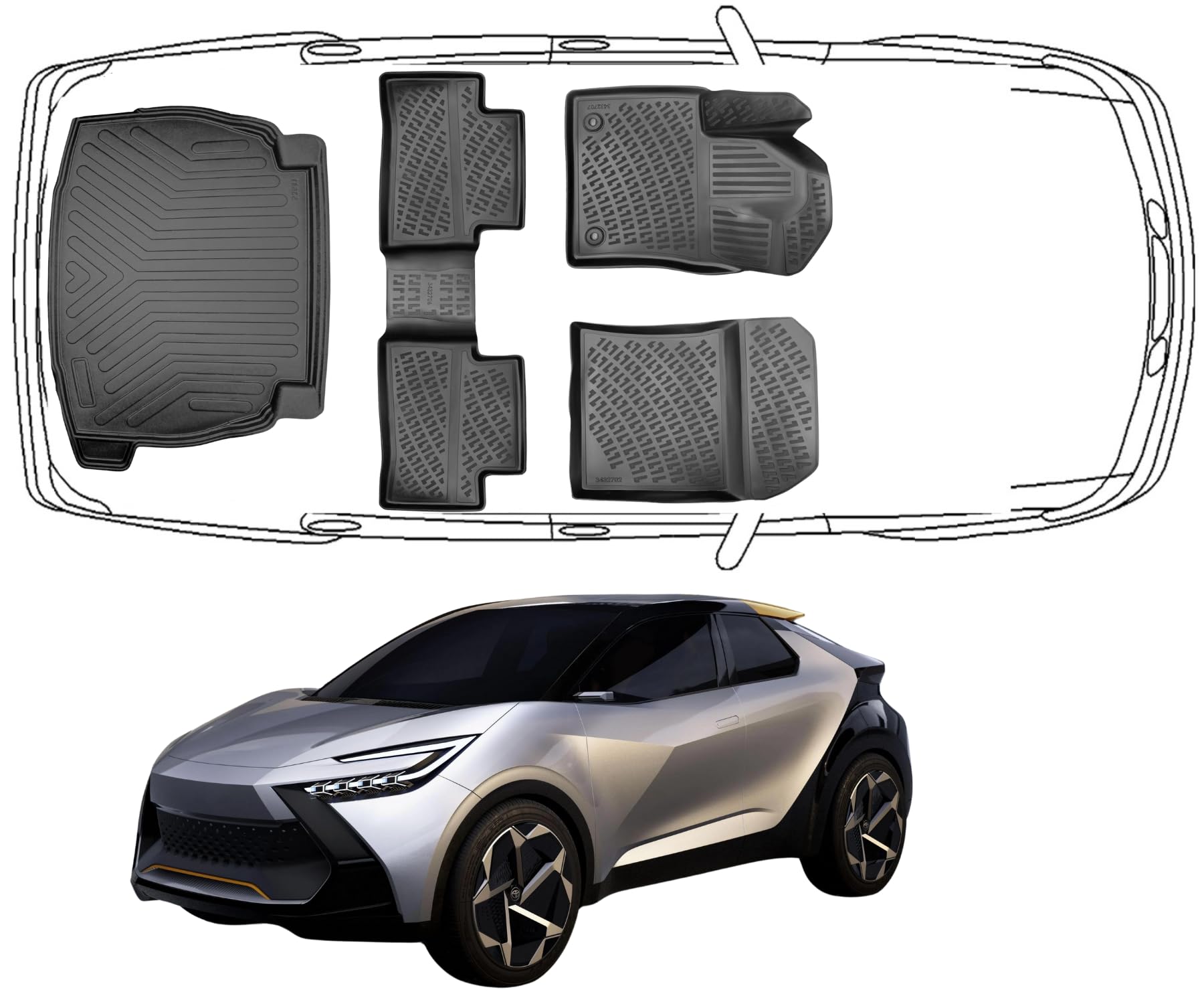 3D Fußmatten & Untere Kofferraumwanne Auto Set Kompatibel mit Toyota C-HR 2-Gen ab 2024 1.8 Hybrid ** Mit JBL Soundsystem **