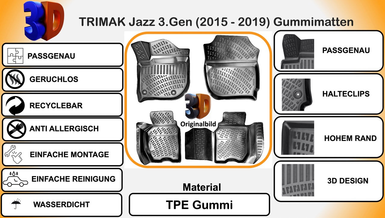 Maximaler Schutz trifft auf perfekte Passform: Die passgenauen Trimak Gummimatten wurden mithilfe modernster 3D-Laserscantechnologie speziell für den HONDA JAZZ 3. Generation (2015 - 2019) entwickelt.