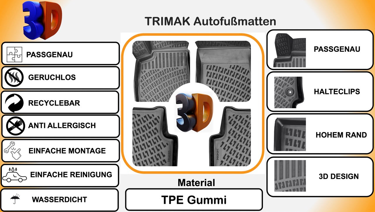 Dank der 3D-Struktur passt sich die Matte perfekt dem Fahrzeugboden an und schützt diesen vollständig vor Schmutz, Feuchtigkeit und Abnutzung. Hergestellt aus umweltfreundlichem TPE-Material, sind Trimak Fußmatten nicht nur robust und langlebig, sondern auch recycelbar und umweltschonend.