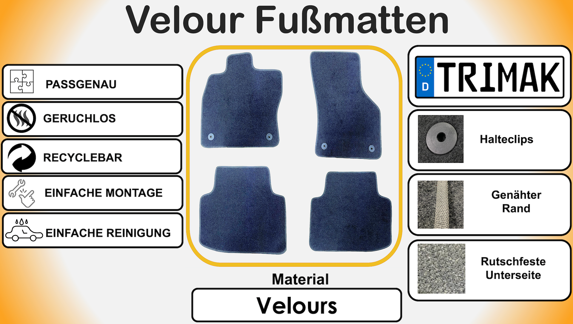 Unsere hochwertigen Fußmatten sind speziell für den europäischen Markt entwickelt und online erhältlich – perfekt abgestimmt auf Ihr Fahrzeugmodell. Bei der Produktion verwenden wir ausschließlich hochwertige Materialien, die geruchsfrei, langlebig und umweltfreundlich sind. Zudem sorgen die erhöhten Ränder dafür, dass der Fahrzeugteppich stets sauber und geschützt bleibt.